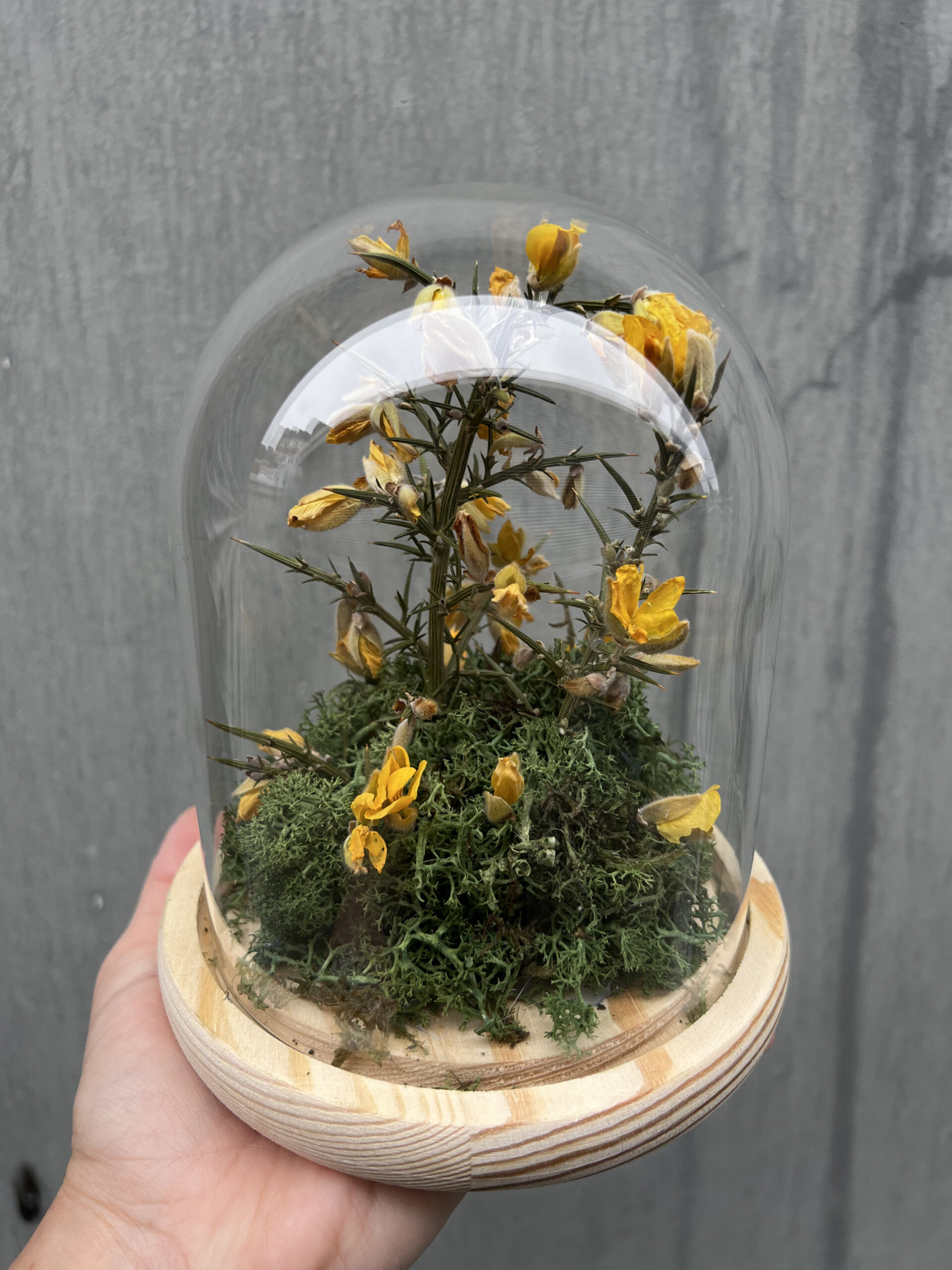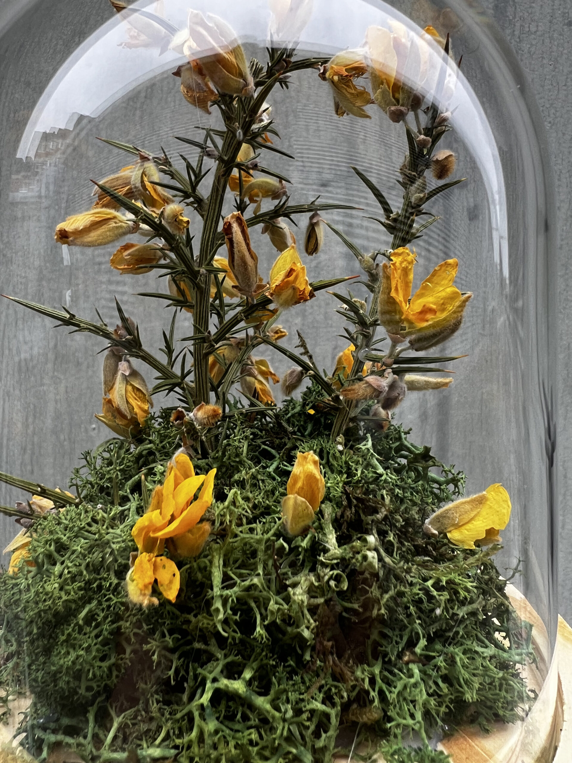 Esta cúpula de cristal es el resultado de un proceso creativo orientado a capturar la esencia de la flora gallega bajo un prisma contemporáneo. La pieza central es el toxo con su flor. Seleccionado minuciosamente por su estructura y la intensidad cromática de su flor amarilla.